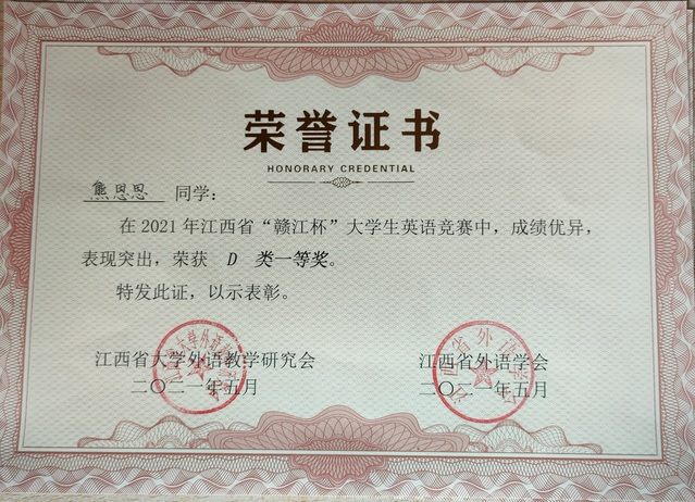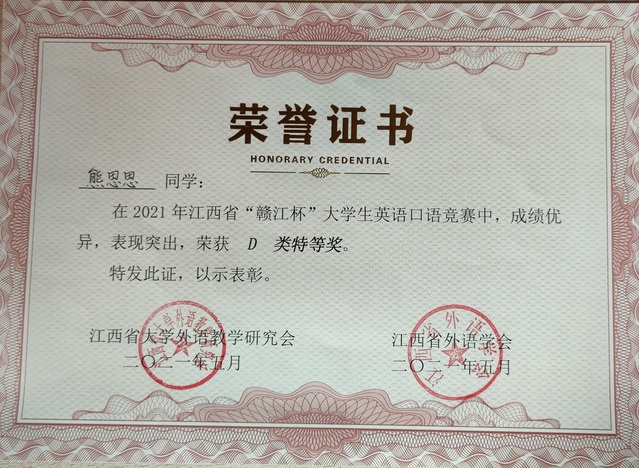 2021年5月16至17日,2020-2021全国大学生英语竞赛江西省决赛暨“赣江杯”大学生英语竞赛在华东交通大学举行,高职学院19级会计专业学生熊思思荣获江西省“赣江杯”大学生英语口语竞赛D类特等奖和大学生英语竞赛D类一等奖。