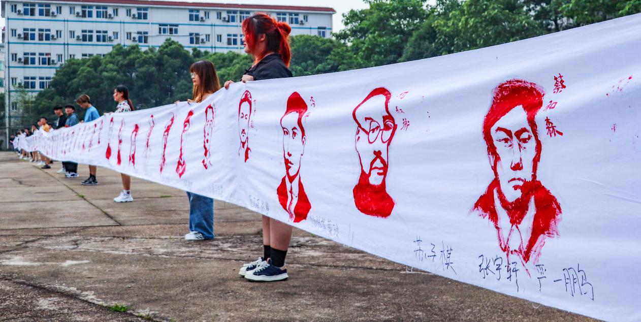 天空湛蓝,骄阳似火。在展开的百米画布前,参加百幅肖像忆英雄手绘的同学,选取了近百位英雄人物作为创作素材,他们用画笔一丝不苟地勾勒着每位英雄肖像,不到两小时,一幅幅英雄肖像展现在师生眼前。院党委副书记陈小松看着同学们额头上豆大的汗珠,深情地说道,“中国共产党的历史是一部丰富生动的教科书,红色基因就存在于这些革命英雄中,在你们创作的作品中能感受到大家的用心和对先烈的敬意,那些英雄的事迹和伟大的信仰也将深深的刻在了你们心中,希望你们能够继承革命先烈的遗志,传承红色基因,把无悔的青春刻写在民族复兴的征程上,我代表学院为你们点赞。”
