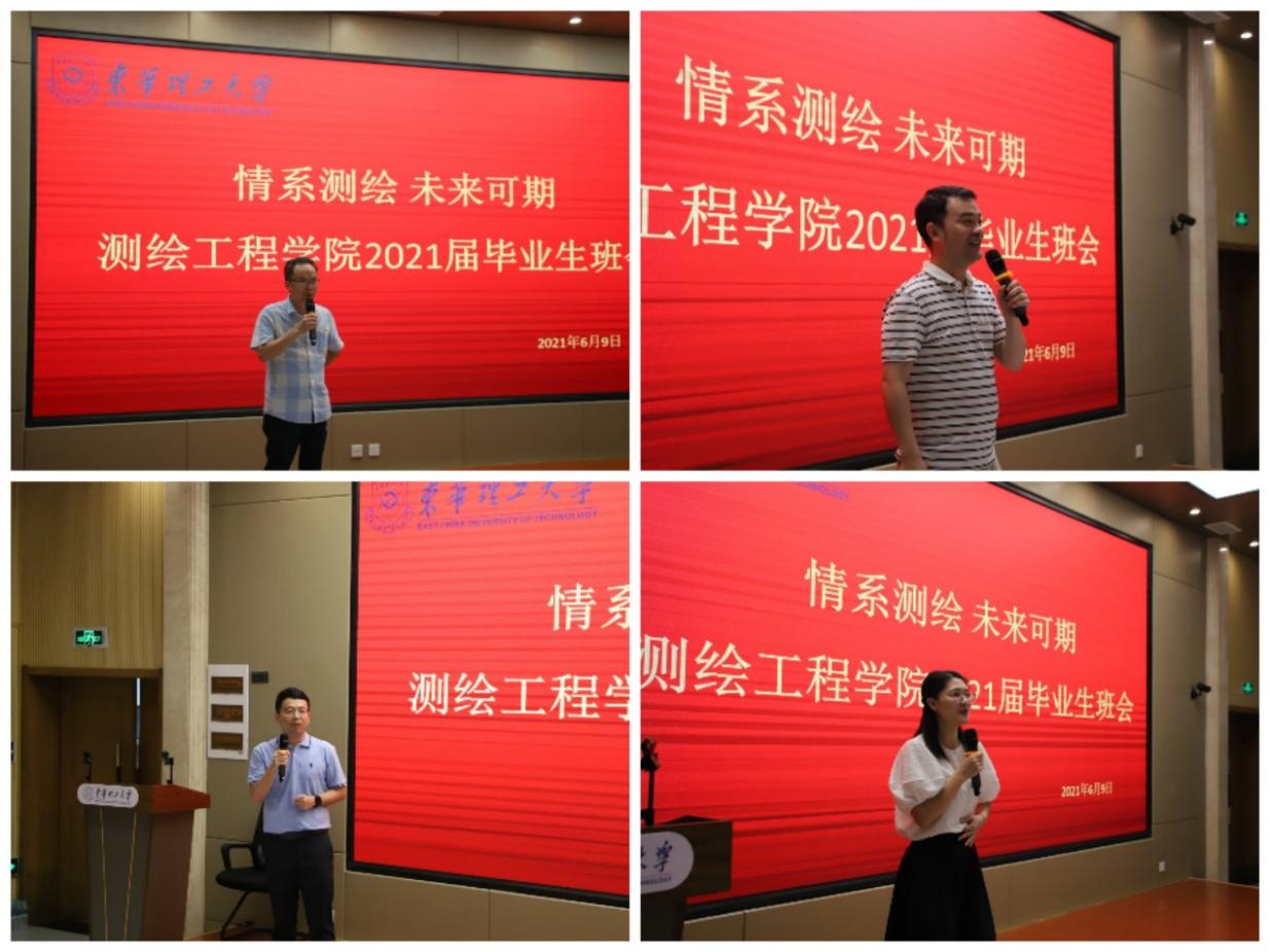 土地资源管理专业班主任汤江龙以16个字“拼搏,进取,最美青春。阳光,向上,更多追求”祝愿毕业生们拼搏向上,突破自我。随后遥感科学与技术专业班主任刘丹、测绘工程专业1班和3班班主任李萌、测绘工程专业2班班主任卢立果、地理信息科学专业班主任惠振阳都向毕业生们表达了自己最诚挚的祝愿。