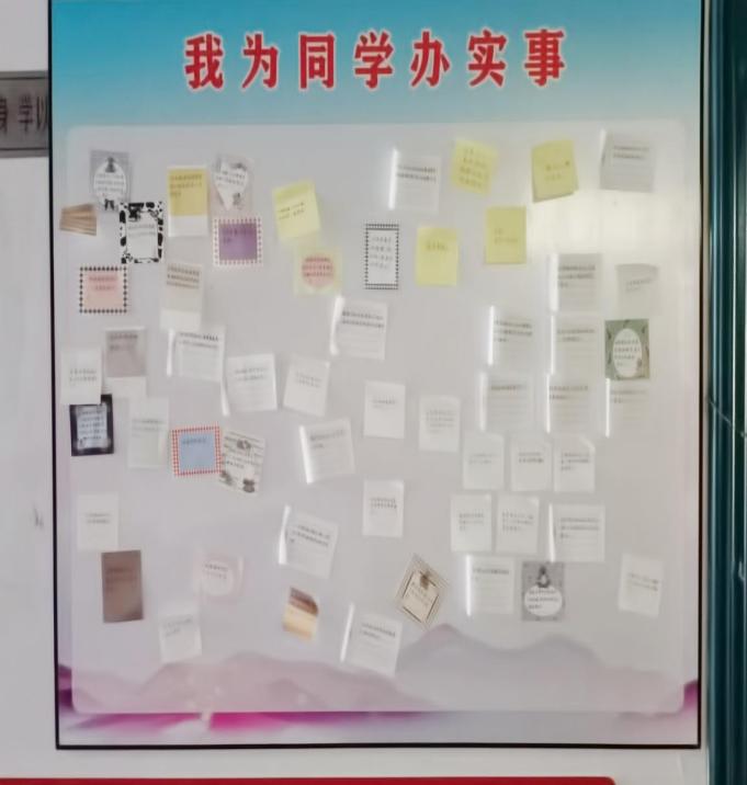 “筚路蓝缕中国路,我以字句颂河山”,宿舍三楼一块醒目的宣传板吸引了徐步朝一行。这是一块写满了经管学子对党和国家祝福与热爱的主题栏。像这样的主题栏,在这条走廊上共有两块,一块承载着对党纯纯的爱与祝福;另一块则收纳着学生的各种“疑难杂症”,学院学生会权益维护部门定期收集学生写在上面的“需求”并及时解决,这样的一块宣传栏更成为了“为学生办实事”的重要途径。