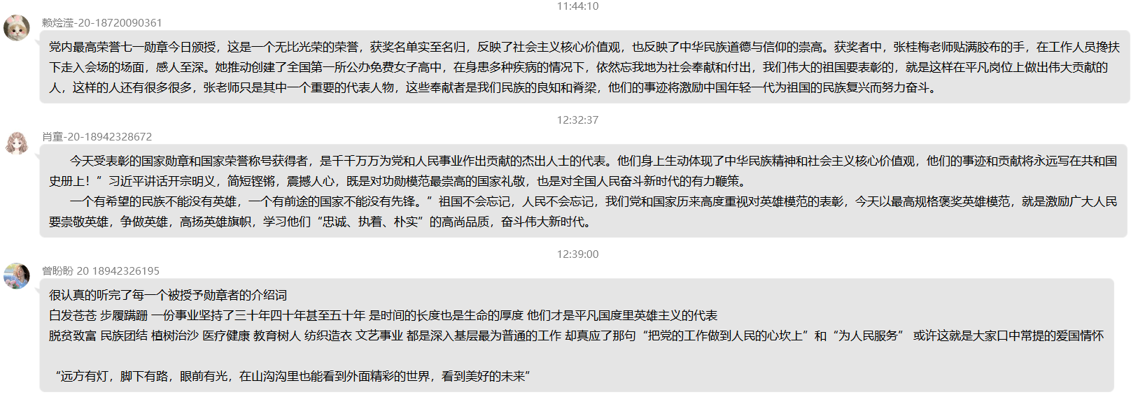通过此次观看七一勋章颁授仪式,大家都觉得收获满满,希望测绘工程学院学子们,坚持学史明理、学史增信、学史崇德、学史力行,在党的百年华诞之际,传承红色基因、坚定共产主义信仰,不断铸就新时代属于我们的赤子之心和高贵品德。在全面建设社会主义现代化国家新征程上,向着第二个百年奋斗目标、向着中华民族伟大复兴的中国梦奋勇前进!(图/文 邹新灿)