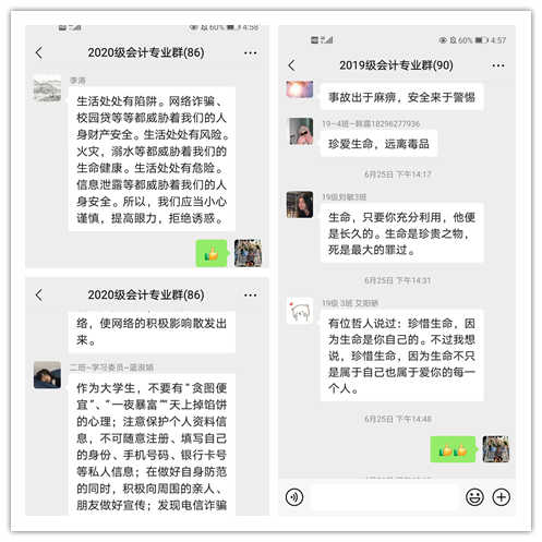 在前期安全主题教育基础之上,黄老师还组织同学们进行了讨论,大家纷纷在群里分享自己的心得感悟: