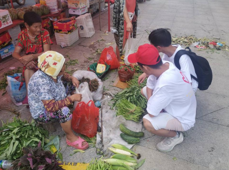 在走访当地农户时,直播组志愿者们了解到一般农田里收获出多余的农作物,都会放置在集市售卖。农民需要早早起床准备,而农产品销售的价格也忽高忽低。随即,志愿者们决定采用直播带货的方式来为农户做宣传。为避免与当地集市产生不必要的价格冲突,志愿者们来到塘南集市,与集市农户协商交谈。成员们大致了解到当地农产品价格以及当地特产的品种和优点,并与集市部分农户达成合作,为他们直播带货。