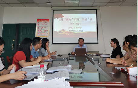 深入学习贯彻习近平总书记在党史学习教育动员大会上的重要讲话, 2021年6月29日,学院党委书记陈泉水以《讲述“四史”教育,争做“四有”教师》为题给经管系全体教师党员讲专题党课,党课由经管系党总支书记付树农主持,经管系教工党员共20余人参加。