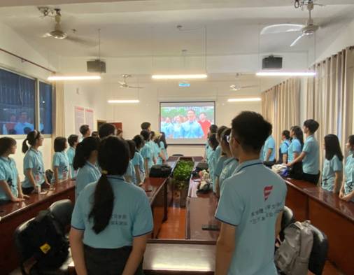 上午8时,师生神情肃穆,屏息凝神地注视着投影仪中天安门广场上的肃穆升旗仪式。伴随着天安门广场上的国歌响起时,在场师生纷纷肃立合唱国歌。画面中,解放军军机划破长空,百响礼炮响彻云霄,阵阵激昂的乐章扣人心弦。