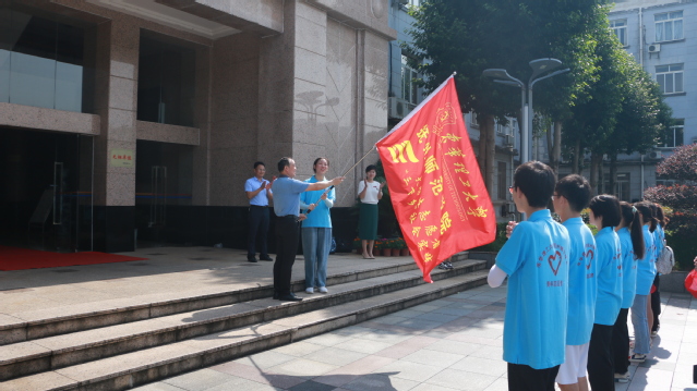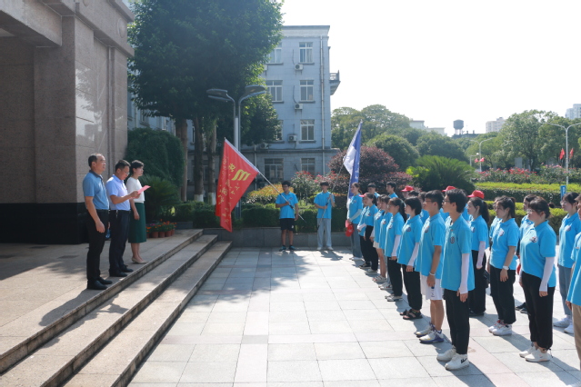 仪式上,师范学院院长颜七笙首先发表致辞,他表示愿志愿者们应立足于师范学院特色,开展以特色支教为主线,并拓展科普实践、宣传推广、文艺汇演等其它一系列实践服务活动,大力弘扬“奉献、友爱、互助、进步”的志愿精神,谱写东华理工大学抚州师范学院与里塔镇党委政府携手共进的美好愿望。抚州师范学院“三下乡”志愿服务队队长李文静带领队员进行志愿者宣誓,并由院党委书记章国平为志愿服务队授旗。一声声“我们保证完成任务”激情嘹亮如号角打响了启程的第一号,而迎风招展的院旗和铿锵有力的宣誓,让志愿者们更加踌躇满志,带着学院所有领导和老师的祝愿和期盼,“三下乡”志愿服务队正式踏上了前往里塔镇的路程。