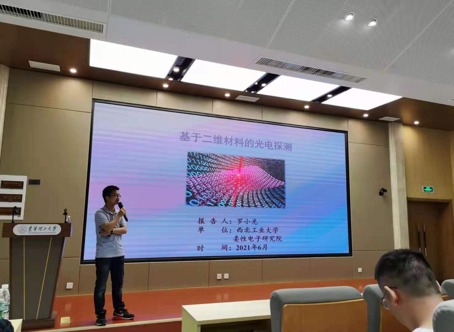 近日,西北工业大学柔性电子研究院研究生招生宣讲暨二维材料的光电探测学术报告在我校4教阶19举行,西北工业大学罗小光博士、宋青副教授以及杨助教,东华理工大学电科系副主任张明智老师、冯林副教授、郭喜涛博士,以及2018级电子科学与技术专业本科生参加讲座。