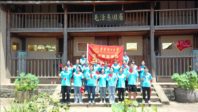 紧接着,志愿者们又前往毛泽东旧居展开调研。毛泽东旧居陈列着床榻、茶杯、桌子、煤油灯等老旧物品。穿越百年,志愿者们站在了毛泽东曾站立的地方,心中怀揣着敬意。调研后,志愿者们在毛泽东旧居的门前列好队伍,手拿国旗,怀着对先辈的感激与崇敬歌唱起《没有共产党就没有新中国》,歌声嘹亮,深情歌唱对党的美好祝福。