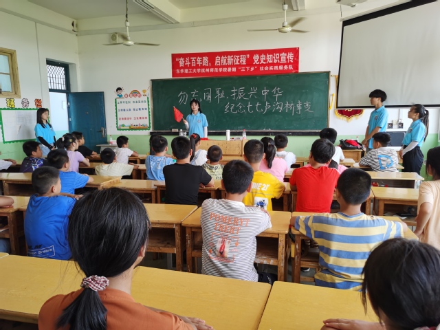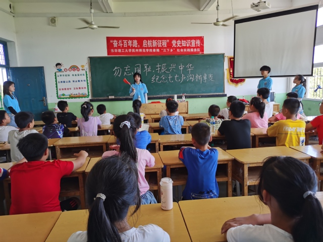 在支教活动中,志愿者们向小朋友们问道:“你们知道今天是什么日子吗?”有位小朋友们举手回答是纪念七七卢沟桥事变发生的日子,引得志愿者们大力夸赞小朋友。志愿者们向小朋友们讲述了有关七七事变的相关知识,介绍了佟麟阁、赵登禹等在七七事变中牺牲的民族英雄,告诉小朋友们不能忘记国耻,要谨记我们新中国的诞生是有千千万万的革命英雄用生命和鲜血铸就的,我们要热爱我们的祖国,热爱我们伟大的中国共产党。小朋友们听后频频点头,同时积极举手发言,主动表达要努力学习,报效祖国,让祖国变得更加强大。随后,志愿者们带领着小朋友们共同歌唱《没有共产党就没有新中国》,小朋友们用稚嫩的声音大声歌唱,歌声中包含着对党和祖国的热爱与祝福之情,对民族英雄的崇敬之情,更有对祖国美好未来的责任担当。最后,志愿者们与小朋友们一起喊出“勿忘国耻,振兴中华,强国有我”的口号,响亮而有力。