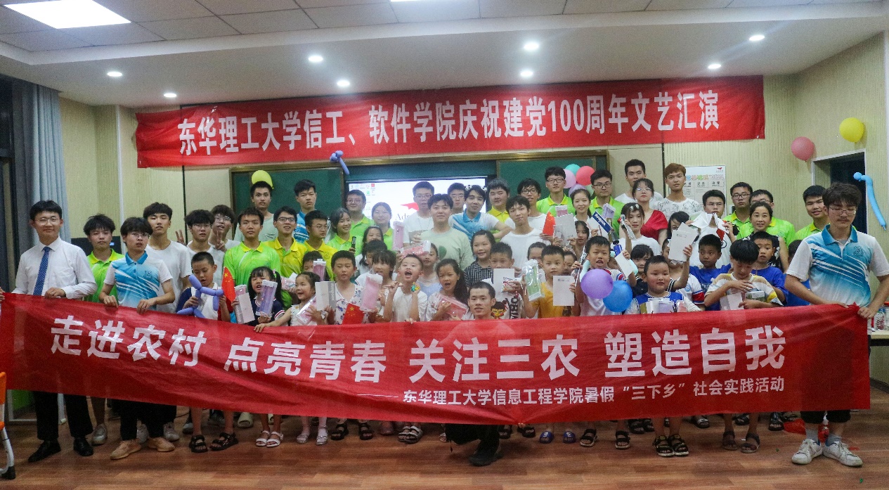 为回顾中国共产党百年奋斗的光辉历程,展望中华民族伟大复兴的光明前景,使红色精神入脑入心入行,信息工程学院暑期社会实践团队心怀对党和国家的热爱,于2021年7月5日晚在九江市温泉镇中心小学顺利开展文艺汇演。