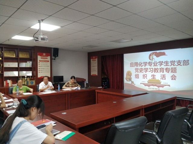 为深入推进党史学习教育,庆祝中国共产党成立100周年,2021年7月7日,应用化学专业学生党支部在核工楼604召开了以“学党史、悟思想、办实事、开新局”为主题的党史学习教育专题组织生活会。校党委常委、组织部部长夏菲同志到会指导并作点评讲话,会议由支部书记李丽主持。