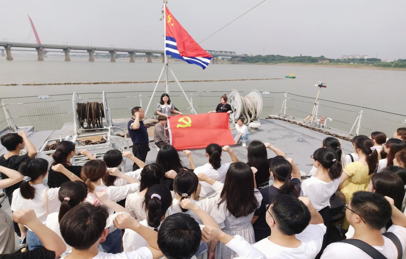 6月25日下午,近70名新党员参观了南昌舰。在南昌舰甲板上,全体党员胸戴党徽,列队整齐,在丁晓卿老师的带领下右手举过肩头,面对鲜红的党旗,坚定而有力地宣誓:“我志愿加入中国共产党,……,随时准备为党和人民牺牲一切,永不叛党!”新党员陈惠清激动地说:在南昌舰参加入党宣誓,有种特别的自豪感和光荣感,我将一辈子都会记得自己今天的入党宣誓仪式和自己的誓言,把南昌舰官兵的“一不怕苦、二不怕死”的革命精神,注入到我生命中去,终生践行入党誓言,以更高的标准要求自己,为党的事业奋斗终身。