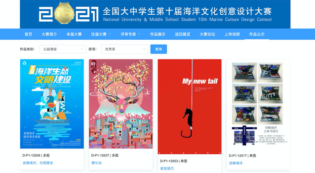 2021年7月3日-4日,由自然资源部宣传教育中心、中国海洋大学、中国海洋发展基金会、自然资源部北海局、海南热带海洋学院共同举办的全国大中学生第十届海洋文化创意设计大赛作品终审会在中国海洋大学崂山校区图书馆展厅举行。来自清华大学、西安美术学院、吉林艺术学院、天津美术学院、同济大学、哈尔滨工业大学、鲁迅美术学院、湖北美术学院、中国传媒大学、山东工艺美术学院、中国海洋大学等多所知名高校评审专家到会,清华大学何洁教授担任终审主席。此次大赛是2021年“世界海洋日暨全国海洋宣传日”期间举办的活动之一,本届大赛共有1055所高校组织参赛,共征集作品38165件,全国所有省份及港、澳、台地区均有作品参赛。经过评审,获奖作品5939件。其中:大学组优秀奖368件,佳作奖4628件。