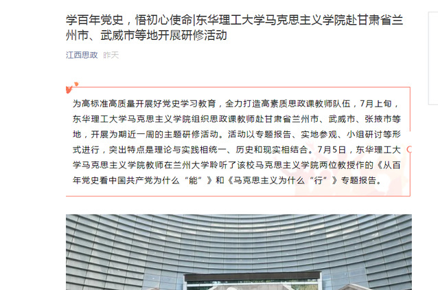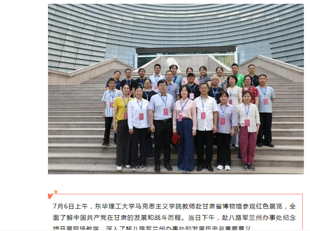 编者按:为高标准高质量开展好党史学习教育,全力打造高素质思政课教师队伍,7月上旬,东华理工大学马克思主义学院组织思政课教师赴甘肃省兰州市、武威市、张掖市等地,开展为期近一周的主题研修活动。江西思政媒体对此进行报道,现将相关内容转载如下: