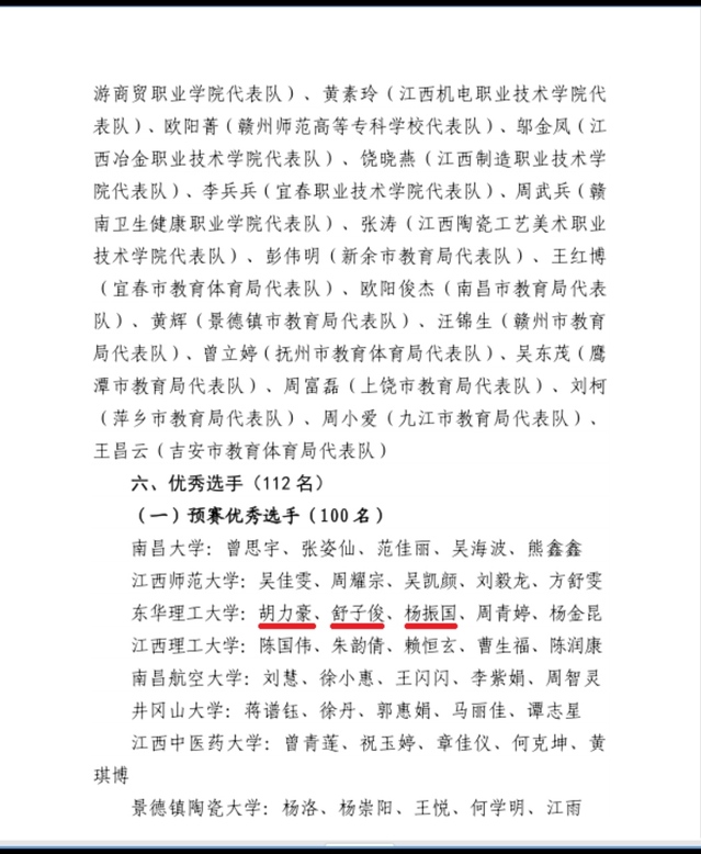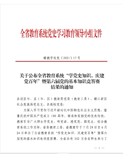 近日,中共江西省委教育工委、江西省教育厅印发了《关于公布全省教育系统“学党史知识,庆建党百年”暨第六届党的基本知识竞答赛结果的通知》(赣教学组发【2021】17号),我校5位同学在预赛中荣获优秀选手称号,其中胡力豪、舒子俊、杨振国3名同学来自国防教育学院。此次党的基本知识竞答赛江西省教育系统有100名学生获得预赛优秀选手、12名学生获得决赛优秀选手。