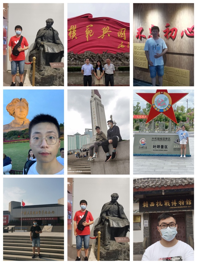 我们的师生来自祖国的大江南北、五湖四海,就像一支支红色的旗帜,在火热的炎夏,将心中“红色的火焰”播撒到革命先烈曾用血色染红的故土上。一寸山河一寸血,一抔热土一抔魂,赣州兴国将军园、湖南长沙橘子洲、八一起义纪念塔、中国人民抗日战争纪念馆、新红四军军部旧址陈列馆、赣西抗战博物馆、小平小道、中央红军长征集结出发地、共和国摇篮叶坪景区、西柏坡廉政教育馆等等。追寻革命先烈的足迹,学党史得感悟,同学们站在红色热土之上,感受先辈们的岁月峥嵘。