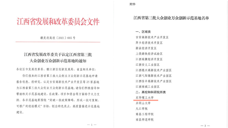 近日,从《江西省发展改革委关于认定江西省第三批大众创业万众创新示范基地的通知》(赣发改高技【2021】665号)文件获悉,我校成功获批“江西省大众创业万众创新示范基地”。