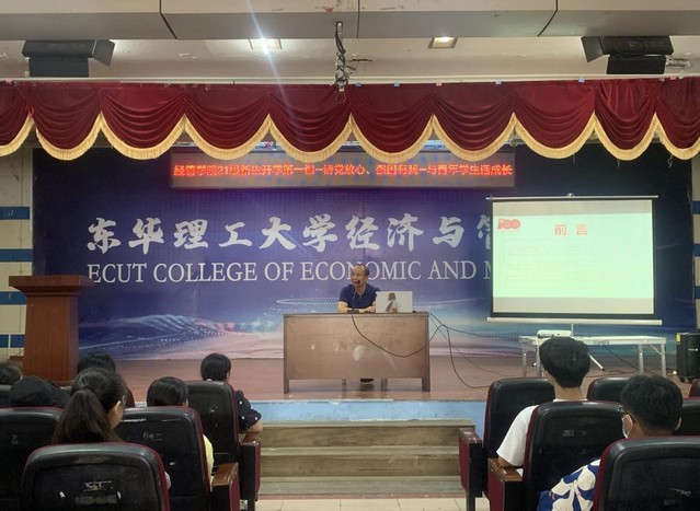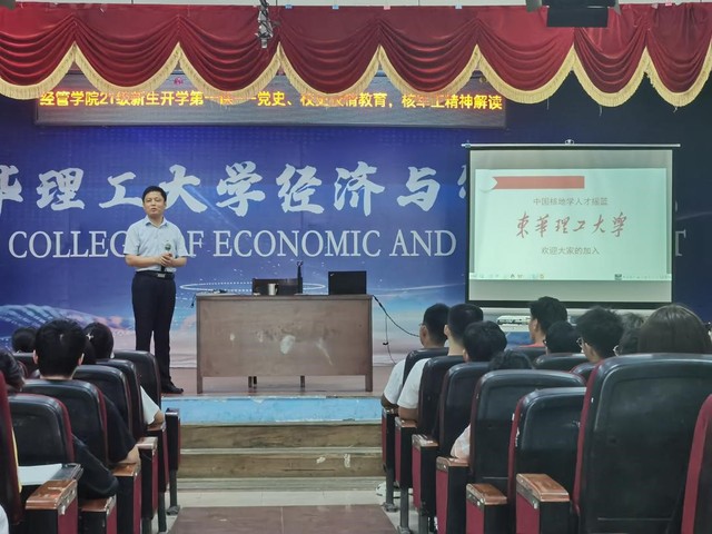 经韬济略汇新才,管智理世展雄风。为深入开展党史学习教育,帮助21级新生快速了解校史校情,赓续传承核军工精神,9月8日,经济与管理学院在经管楼一楼报告厅组织开展了以“从百年党史中汲取前行的力量”为主题的“开学第一课”。学院党委书记徐步朝、党委副书记罗志洪为21级新生授课。