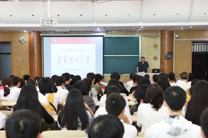 9月8日上午,校党委常委、副校长聂逢君教授在抚州校区大礼堂为艺术学院新生“开学第一课”系列活动拉开帷幕。聂教授饱含激情地讲述了学校的历史沿革,发展现状,人才培养模式,办学特色,发展思路,并阐释了核军工文化的来源与内涵,引导同学们明德厚学,爱国荣校,勤奋严谨,求实创新,勇敢追梦,做德智体美劳全面发展的社会主义新青年。