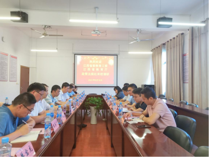 9月16日下午,江西省教育厅政策法规处何永明处长、刘科荣副处长一行来校调研江西省教育普法研究分中心工作。学生工作处、校团委、文法学院、江西省教育普法研究分中心等部门负责人和相关科室工作人员、研究员等参加调研会。