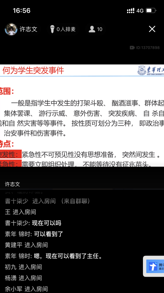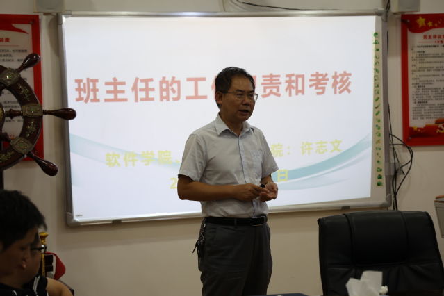 许志文分别作了题为《班主任的工作职责和考核办法》、《学生突发事件的预防与处置》的专题培训,他对班主任的工作职责和考核要求进行全面剖析,讲道班主任是学生思政政治的引领者、要做好学生的学业指导与困难学生的帮扶工作,在学科竞赛中更是要起到指导的作用,班主任是引导学生专业知识学习与答疑解惑的重要力量,要立足岗位,定职定责,努力成为学生成长成才路上的引路人。针对第二专题培训内容,许志文分别从何为学生突发事件、处置学生突发事件的方法、处置学生突发事件的原则、处置学生突发事件应注意的问题五个方面进行了讲解。