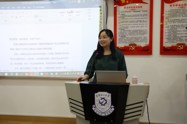 徐俊莎作了题为《心理危机的识别和干预》的专题培训,她从学生心理危机的识别、如何进行心理危机干预两个维度展开阐述。教育大家要认识到学生是我们共同服务、关心、关注的主体,当学生遇到困难时,作为班主任、辅导员要“主动出击”,主动给予关怀与关爱,在处理问题前作为老师要学会先接纳而不是先批判,先鼓励而不是先落责。整场讲授,从心理危机事件的举例、引证、解读,到后期的处理干预方法、效果点评以及危机预防等等,给在场的老师传授了许多心理专业的信息,也提高了大家有关学生心理问题的基本应对技能与技巧。