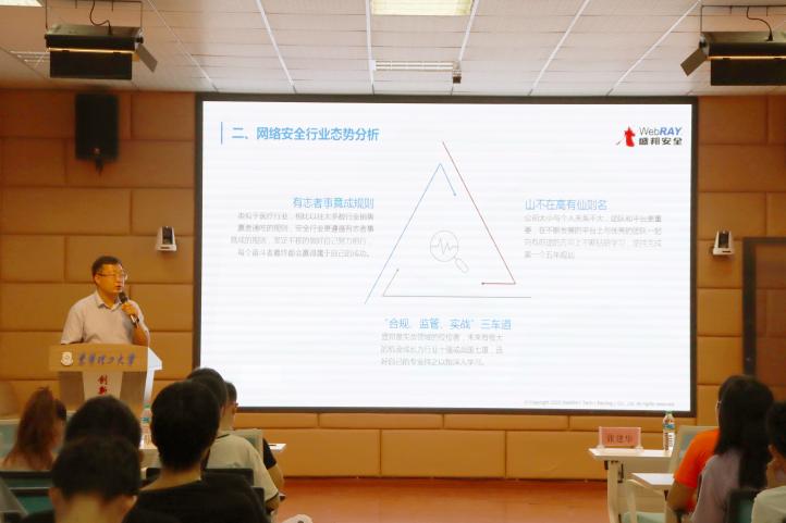 为加强同学们对网络安全行业现状和职业前景的认识,帮助同学们树立正确就业创业观,2021年9月27日下午,理学院于创新创业学院106室举办了优秀校友指导讲座,东华理工10级优秀校友、远江盛邦(北京)网络安全科技股份有限公司副总裁高志欢应邀担任主讲人,讲座由理学院副院长张建华主持,创新创业学院党委书记王合义及理学院2019级信息管理与信息系统专业学生参加了本次讲座。
