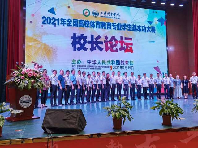 比赛期间,副校长刘云海应邀参加了以“坚持健康第一、深化体教融合”为主题的校长论坛。在论坛中,刘云海作了题为“健康中国战略视域下高校课外体育活动‘三维五位一体’管理模式的研究与实践”报告。他指出,全国高校体育教育专业学生基本功大赛的举办赋予了体育领域更多重要内涵,对全面推进高校体育教育专业的课程设置、学科设置将产生积极影响,作为体育教育专业的学生,要以体育教师应具备的教会、勤练、常赛能力要求自己,不断学习,与时俱进,丰富自己的专业知识。