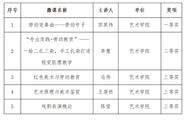 音乐与舞蹈系苏英伟老师的“劳动变奏曲——劳动号子”课程荣获一等奖;视觉传达设计系李慧老师的“专业实践+劳动教育”—— 一绘二扎三染,手工扎染打造视觉肌理教学”课程荣获二等奖;视觉传达系马老师的“红色美术与劳动教育”课程、环境艺术设计系王斐然老师的“艺术原理与美术鉴赏”、音乐与舞蹈系陈莹老师的“戏剧表演概论学”荣获三等奖。