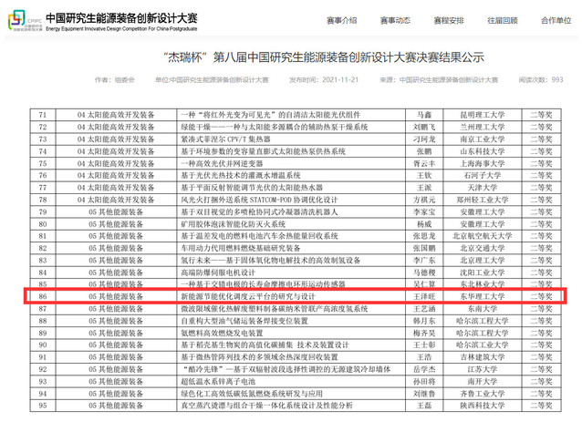 中国研究生能源装备创新设计大赛是由教育部学位管理与研究生教育司、教育部学位与研究生教育发展中心指导,中国学位与研究生教育学会、中国科协青少年科技中心联合主办的“中国研究生创新实践系列大赛”主题赛事之一。大赛旨在激发研究生的创新热情,培养研究生的创新思维,提升研究生的创新实践能力,促进国家能源装备业创新发展。此次比赛于2021年4月正式开赛,共有193个研究生培养单位的1261个参赛团队成功提交作品。参赛作品经线上评审、线上分组答辩后共有来自147所研究生培养单位参赛队获得一等奖39项,二等奖81项,三等奖235项。