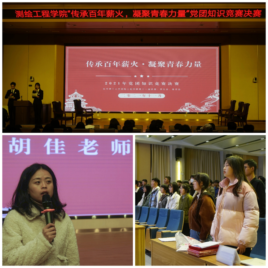 为深入学习贯彻习近平新时代中国特色社会主义思想、落实习近平总书记“七一”重要讲话精神,教育引导广大共青团员了解党的光辉历史、感悟党的初心使命、领会党的创新理论、传承党的红色基因,东华理工大学测绘工程学院于2021年11月23日晚在新实验大楼一楼报告厅举办了“传承百年薪火,凝聚青春力量”主题党团知识竞赛活动。