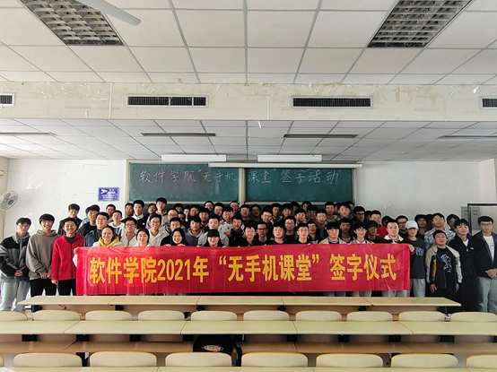 为加强学风建设,培育优良学风,引导学生养成良好的学习习惯,打造软件学院课堂新风貌。软件学院分别在南昌、抚州两地校区开展了2021年“无手机课堂”签字仪式。软件学院党委副书记许志文,学团办主任徐春金,团委书记尚珂,2020级、2021级全体辅导员和2020级班委、2021级全体同学参加了此次活动。