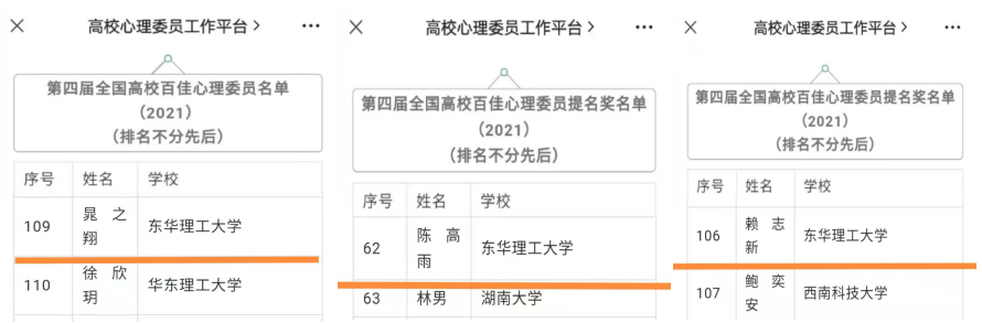 经过“全国高校心理委员工作平台”组织的候选心理委员的文字及视频资料展示、评定委员会评定和公示等环节,共评选出“全国高校百佳心理委员”150人,“全国高校百佳心理委员提名奖”113人,全校共3人获奖,学院推荐的陈高雨、赖志新两位同学获评“全国百佳心理委员”提名奖。(图\文 谢涛锋)