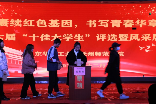 活动最后,评委老师和学生代表纷纷上台将填好的选票投入投票箱,选出他们心中的“十佳大学生”。