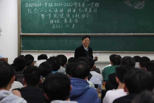 此次班会以“纪念‘一二·九’运动,传承红色基金”为主题,聂逢君从一二·九运动的背景讲起,从学生运动、抗日救亡等历史事件入手,和同学们讲解了半封建半殖民地的旧中国在中国共产党的领导和奋斗下,是怎样站起来、富起来、强起来的。他说:“青年同学们身上肩负了很大的责任,少年强则国家强,毛主席曾说青年就是早晨八九点钟的太阳,在座的你们就是祖国的未来。”最后,聂逢君对同学们提出了两个希望:希望今天的班会可以带给每位同学在学习、思想、道德、文化、身体上的进步;希望在座的所有同学努力学习科学文化知识,听党话,跟党走,今后成为国家建设的栋梁,人人成为实现中华民族伟大复兴的中国梦征程的的建设者和贡献者。