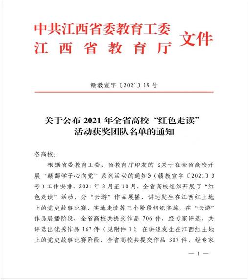 近日,江西省委教育工委、省教育厅公布关于2021年全省高校“红色走读”竞赛活动结果,在全省各高校提交的1000余份优秀作品中,文法学院参赛代表团队成绩喜人,获得党史故事比赛一等奖1项、实地走读成果奖三等奖1项,2个队伍荣获“云游”作品展播“优秀作品团队”称号。