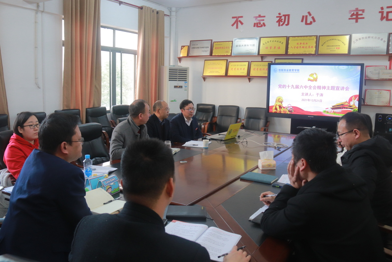 12月21日下午,创新创业教育学院在双创楼308会议室召开党总支中心组第十一次(扩大)学习会,邀请江西质谱科学与仪器重点实验室副主任、学校宣讲团成员于涛副教授作党的十九届六中全会和省第十五次党代会精神专题辅导。院长王学刚、学院全体教职工参加了会议,会议由学院党总支书记王合义主持。