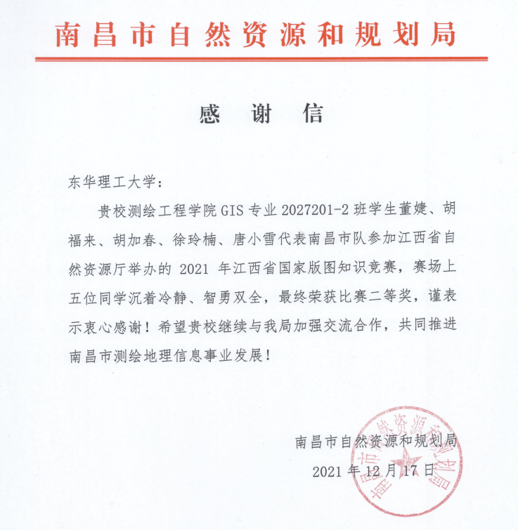 南昌市自然资源和规划局专门写了一封感谢信给学校,在信中高度表扬了测绘工程学院董婕等五位同学在比赛中沉着冷静、智勇双全,为南昌市代表队获得荣誉。同时信中还强调了要加强与学校的合作和交流,推进南昌市测绘地理信息事业发展。