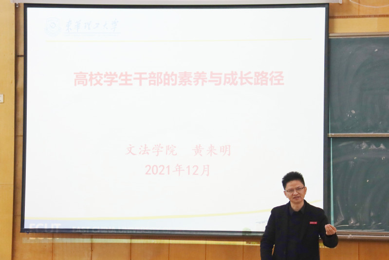 黄来明以学生干部的素质养成与成长规划为主题,结合自身实践经历,从“高校学生干部的角色”“高校学生干部的素养”“学生管理工作的核心”“学生干部成长路径”四个部分展开本次会议的讲述。