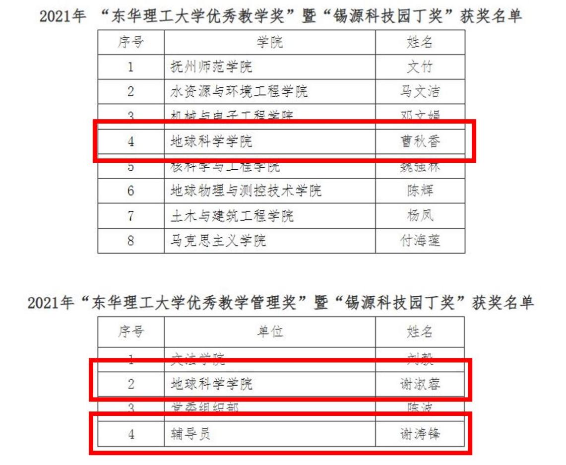 近日,2021年度“东华理工大学优秀教学奖、优秀教学管理奖”暨“锡源科技园丁奖”结果揭晓。地球科学学院曹秋香老师荣获“东华理工大学优秀教学奖”暨“锡源科技园丁奖”,谢淑容、谢涛锋2位老师荣获“东华理工大学优秀教学管理奖”暨“锡源科技园丁奖”。