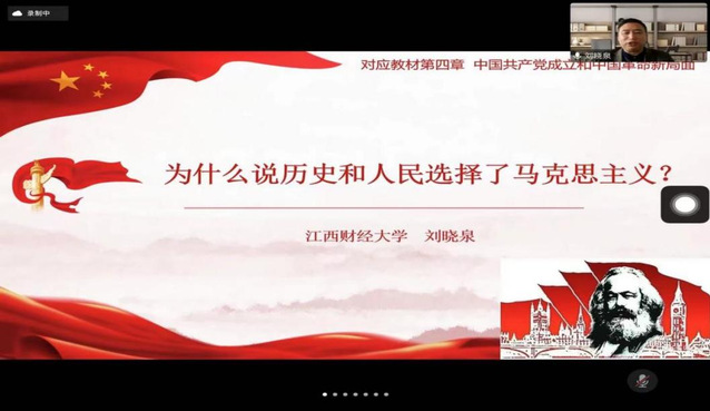 2022年3月18号上午,在习近平总书记“3·18”重要讲话三周年之际,江西财经大学马克思主义学院党委书记、博士生导师刘晓泉教授通过“腾讯会议”的方式开展线上教学,为我校《纲要》课“问题式专题化”教学实验班讲授“为什么说历史和人民选择了马克思主义?”