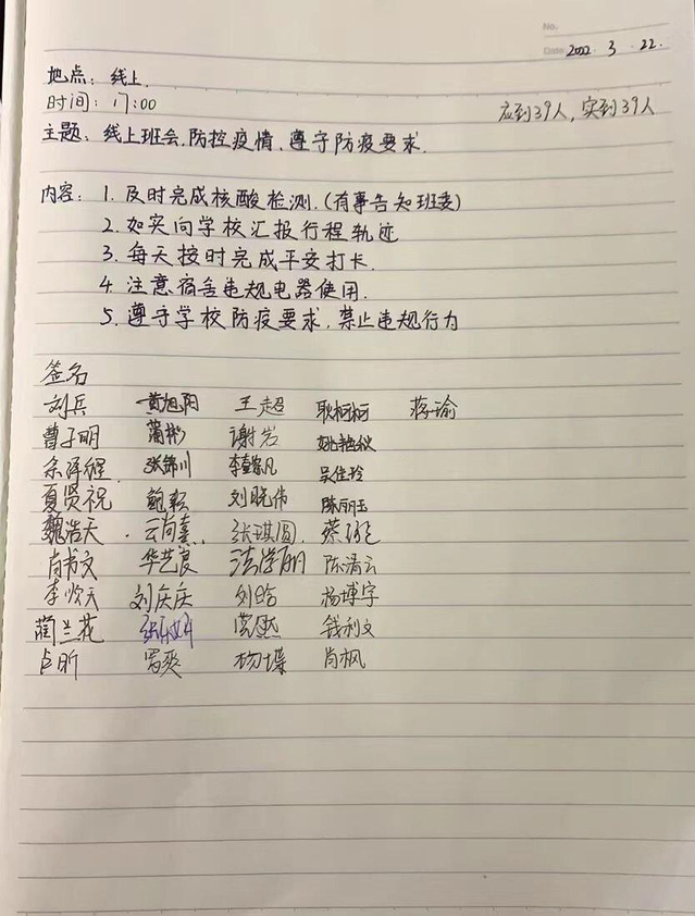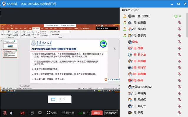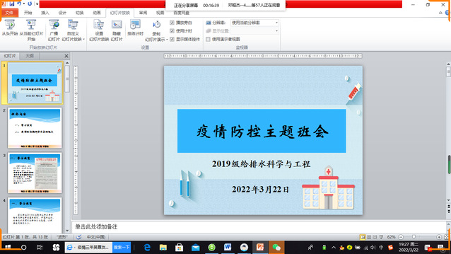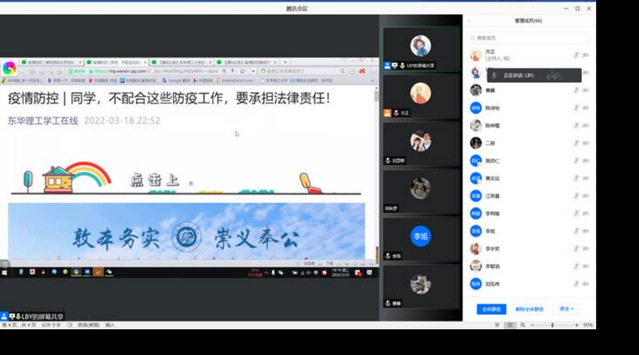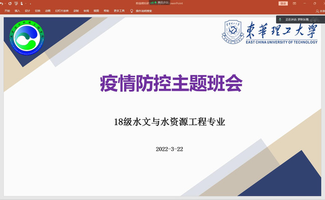 根据学校疫情防控相关会议精神,为进一步做好学院疫情防控工作,水环学院快速响应,明确责任,组织全体班主任开展了形式多样、内容丰富的“云班会、班委会”。通过将疫情防控和思想政治教育相结合,号召广大青年学子增强抗疫的信心和能力,确保学生学习和生活有序开展。班会主要从以下几个方面展开: