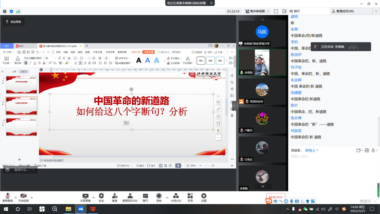 2022年3月25日下午,江西财经大学马克思主义学院副院长、江西省青年井冈学者、江西省“四个一批”人才、江西省“十大思想政治理论课教师”李德满副教授为我校《纲要》课“问题式专题化”教学实验班开展线上教学。