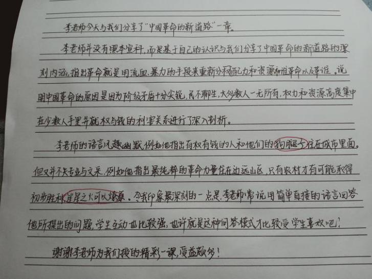 李德满老师的课得到了师生的高度评价。管辉老师认为“李老师的课,全程问题引领,启发学生的思维,引起学生的极大兴趣。且问题的设置,用严谨的逻辑形成链条,一环扣一环,层层推导,直击问题的本质,帮助学生透过纷纭的历史现象,洞悉其发展脉络与规律。”研究生宋锦河也认为“李老师从什么是革命,为什么革命,革谁的命,怎样革命的历史逻辑,用通俗易懂的语言带领同学们理解了中国革命新道路的课程主题。他仅用三张简单的PPT,在线码字的教学新方法,清晰的逻辑、幽默的语言成功吸引了学生口到、眼到、心到。”
