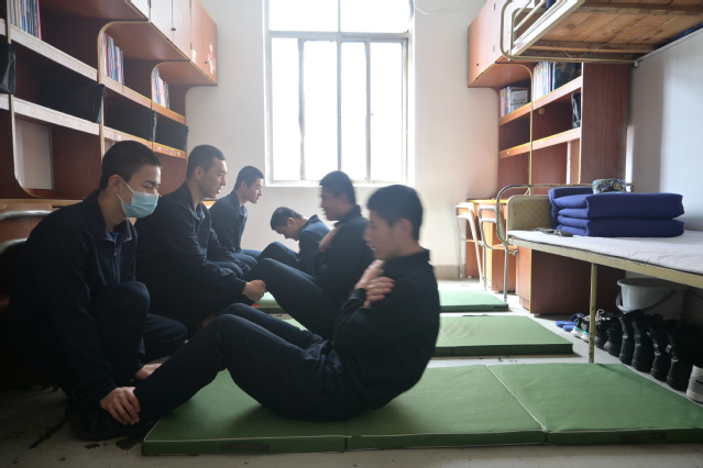 “万老师,8班3月22日跑步的截图、仰卧起坐、拉杠、俯卧撑的照片及宿舍内务的视频已发,请查收”。21中队班主任万军林老师收到了八班班长袁磊的QQ信息,这也是他疫情期间收到最多的信息,“手机信息太多,手机卡得动不了,每隔两天就需要将手机里面的资料导到电脑保存”。疫情期间不能聚集,部队对定向培养士官的培养要求需要专业知识、体能训练 、思政教育、内务养成齐头并进,怎样才能解决这一矛盾,作为军事教研室主任及21中队班主任的他,跟学院建议体能训练化整为零,以班级寝室为单位进行,得到了学院领导的大力支持。为了让定向培养士官养成良好的学习习惯和生活习惯,针对疫情这一特殊时期,学院重新修订了《国防教育学院海军定向培养士官宿舍内务标准》,开展“定向培养士官内务整治专项活动”。