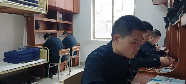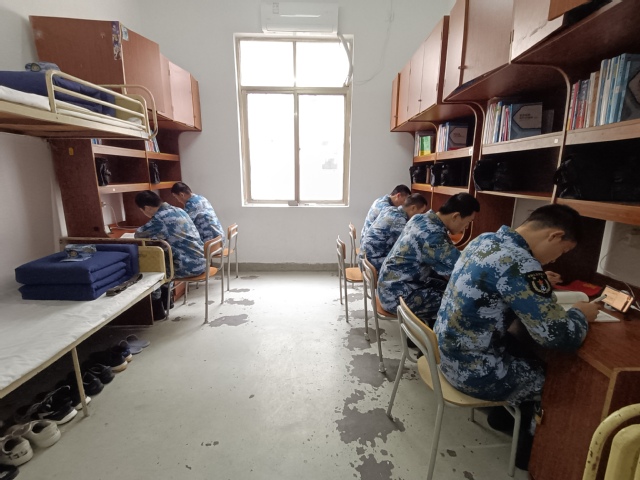 7:50,学府校区2栋306宿舍6名定向培养士官们已打开腾讯会议端座在书桌前,准备上课,这是疫情期间上课的常态了。寝室长吴元昊说:“线上上课真的考验我们的自觉性,在线上,只要进入课堂了,老师也看不到我们到底在不在听,再加上线上交流有点滞后,所以一开始还想耍点小聪明,比方挂在课堂上去做点别的事,或就在床上听课。班主任、辅导员线上中队会对线上学习提出了具体要求,线上上课第一天,书记、院长及学院其它老师就来到我们宿舍,查看我们的上课情况。看到学院如此重视我们的学习,我们自己可不能掉链子。”学院为了让定向培养士官线上学习效果不打折,安排所有老师轮班,确保每天有一个老师下到定向培养士官宿舍,对定向培养士官的内务、上课情况进行督查。