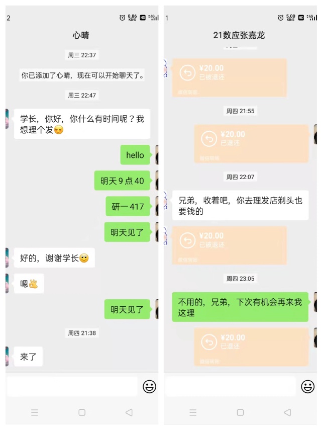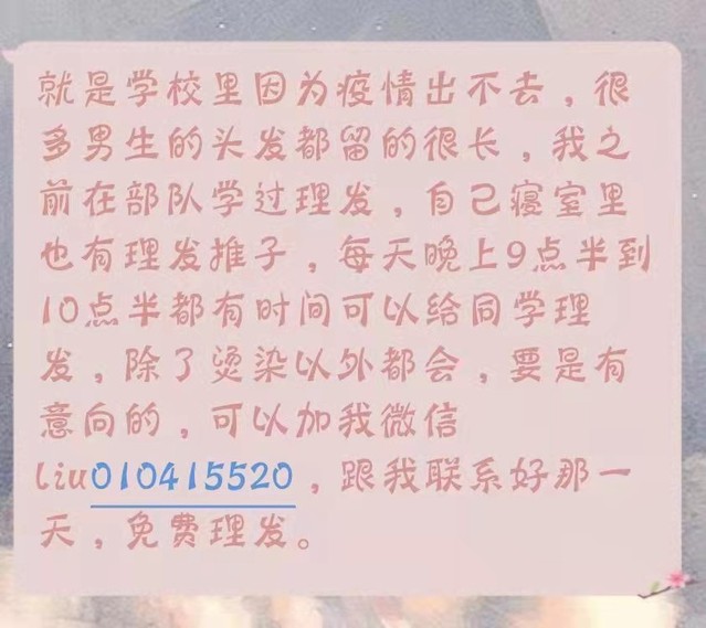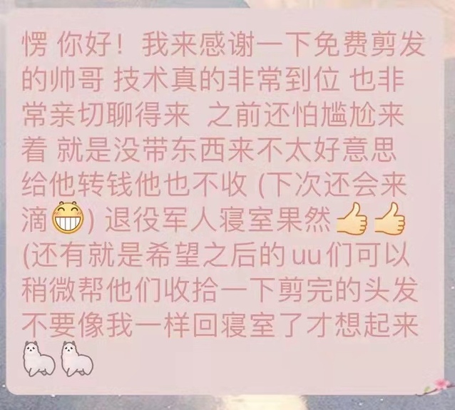 “学长,你好,什么时候有时间,我想理个发”;“愣,你好!我来感谢一下免费剪发的帅哥,技术真的非常到位,也非常亲切聊得来,之前还怕尴尬来着,就是没带东西来不太好意思,给他转钱他也不收,退役军人寝室果然赞……”这一条条消息均来自一个个陌生的QQ咨询和表白墙里的肯定,虽然互相不认识,但他们的话语确让大家减少了陌生,感受了温暖。这就是软件学院7栋417寝室四位退役军人在疫情防控期间为全校学子推出“爱心‘疫’剪, 暖心‘疫’刻”义务理发活动获得的满满收获。