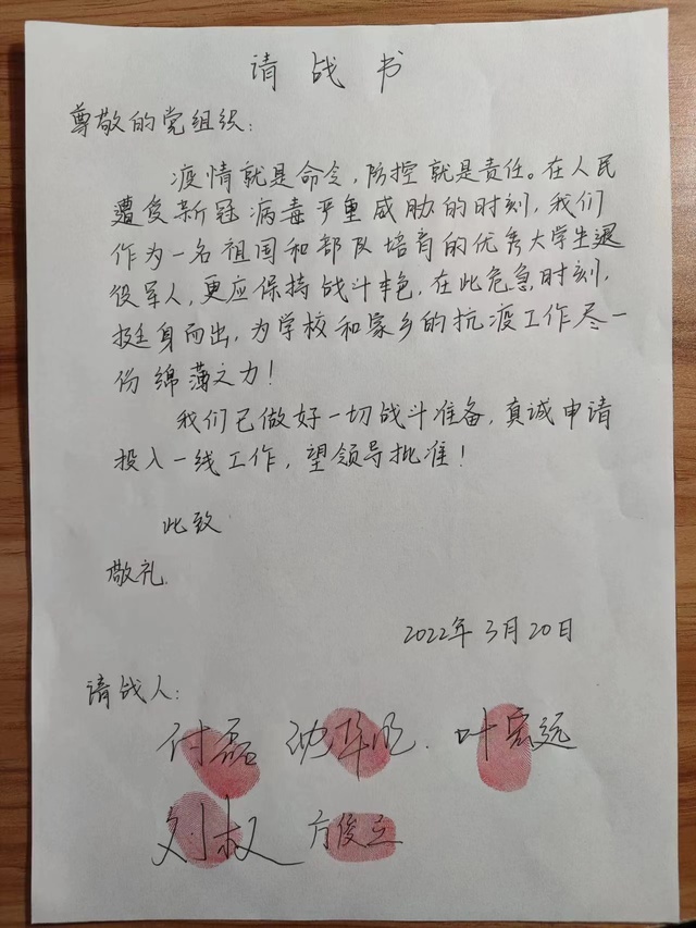 据悉, 417寝室同学在学校刚实行封闭管理期间,根据学校相关工作要求和疫情防控工作需要,连夜手写请战书,要求加入到抗疫队伍中去,坚决做到“听党指挥,若有战,召必回,战必胜”,他们用退伍不褪色,退役不退志的军人钢铁意志构筑起阻击疫情的坚固防线,贡献自己的青春力量。