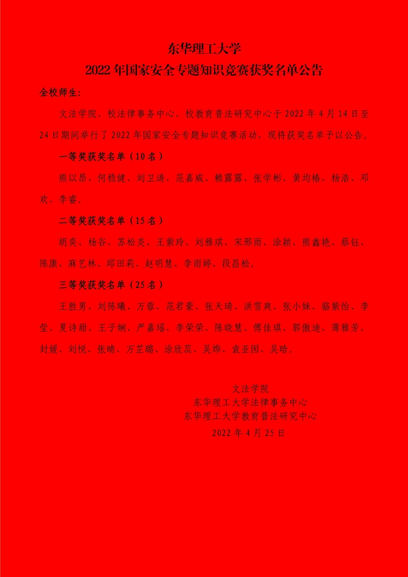 校内各学院师生踊跃参与,活动取得圆满成功。熊以昂等10名选手荣获一等奖,胡奕等15名选手荣获二等奖,王胜男等25名选手荣获三等奖。通过本次活动,师生们对国家安全有了更深的认识,进一步提升了国家安全意识,增强了维护国家安全的责任感。(文/图 周春华)