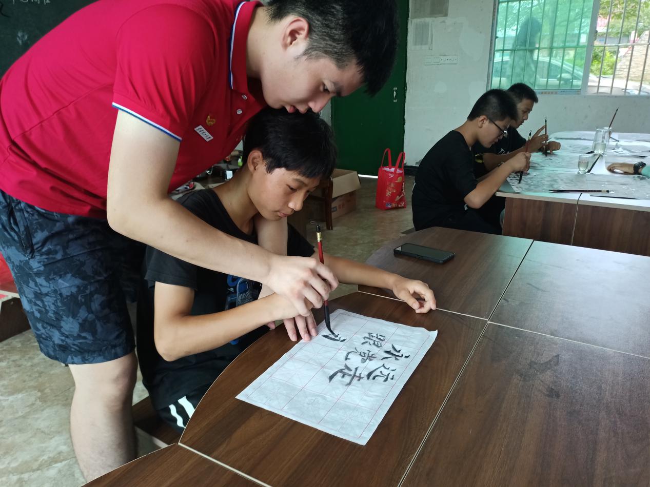 为增强仙下中学学生的身体素质,实践团队成员开展乒乓球、羽毛球、篮球等多种形式的趣味体育教学活动,实践团队成员们化身小老师,用耐心和热情为当地孩子打开一个五彩斑斓的体育世界。在课堂结束时,彭同学说道:“感谢哥哥姐姐们教我打乒乓球,我喜欢这样的体育课堂,既有趣又能锻炼身体。”为提高同学们的安全意识,实践团队成员用通俗易懂的语言、生动形象的案例将“电信诈骗的种类”“电信诈骗的防范方法”及“防溺水小知识”讲的清晰透彻。队员们采用的互动问答的形式,不仅提高了教学课堂的气氛,也让孩子们将安全警示铭记在心。为提高当地学生爱党爱国热情,实践团队队员开展以“庆建团百年 谱青春华章”为主题的绘画和书法课堂。在绘画课堂上,队员们向当地学生介绍团徽的内容和象征意义,并用绘画的方式展示中国共产主义青年团的发展历程。在书法课堂上,队员们为同学们讲解毛笔书写的注意事项,并耐心地指导他们进行书写。书法课堂的顺利开展,让翰墨的书香传递到了乡村地区,将传统中国“美”带到乡村青少年身边,帮助他们提升人文美学素养。